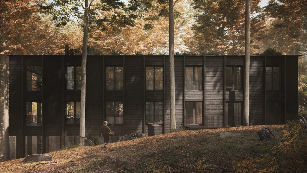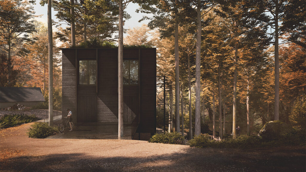 L’enveloppe se compose d’un bardage en bois brûlé de type Sou-Sugi-Ban, choisi pour sa technique traditionnelle ancestrale, sa texture unique, son aspect contemporain, son absence d’entretien et sa capacité à se fondre dans les tonalités sombres du sous-bois. Sa texture vibrante répond aux variations saisonnières du paysage, renforçant l’impression d’une architecture ancrée dans son contexte.